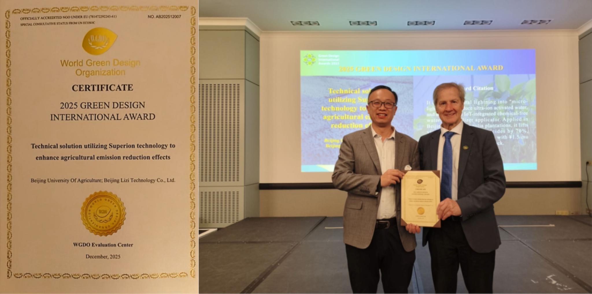 孙运金副教授的设计方案“Technical solution utilizing Superion technology to enhance agricultural emission reduction effects”荣获“2025年度绿色设计国际奖”。该项目聚焦于超离子技术提升农业减排效果的技术解决方案,突破了超离子体放电局限于放电区域的瓶颈,并产生长时间稳定存在的超离子体活性水,满足大空间、规模化的应用场景。超离子活性水以物理手段激活农业系统内生动力,从源头削减化学品依赖,为绿色农业提供“增产-减排-提质”三位一体的服务。本次获奖有力推动了团队绿色设计理念和成果在全球范围内的传播和应用。